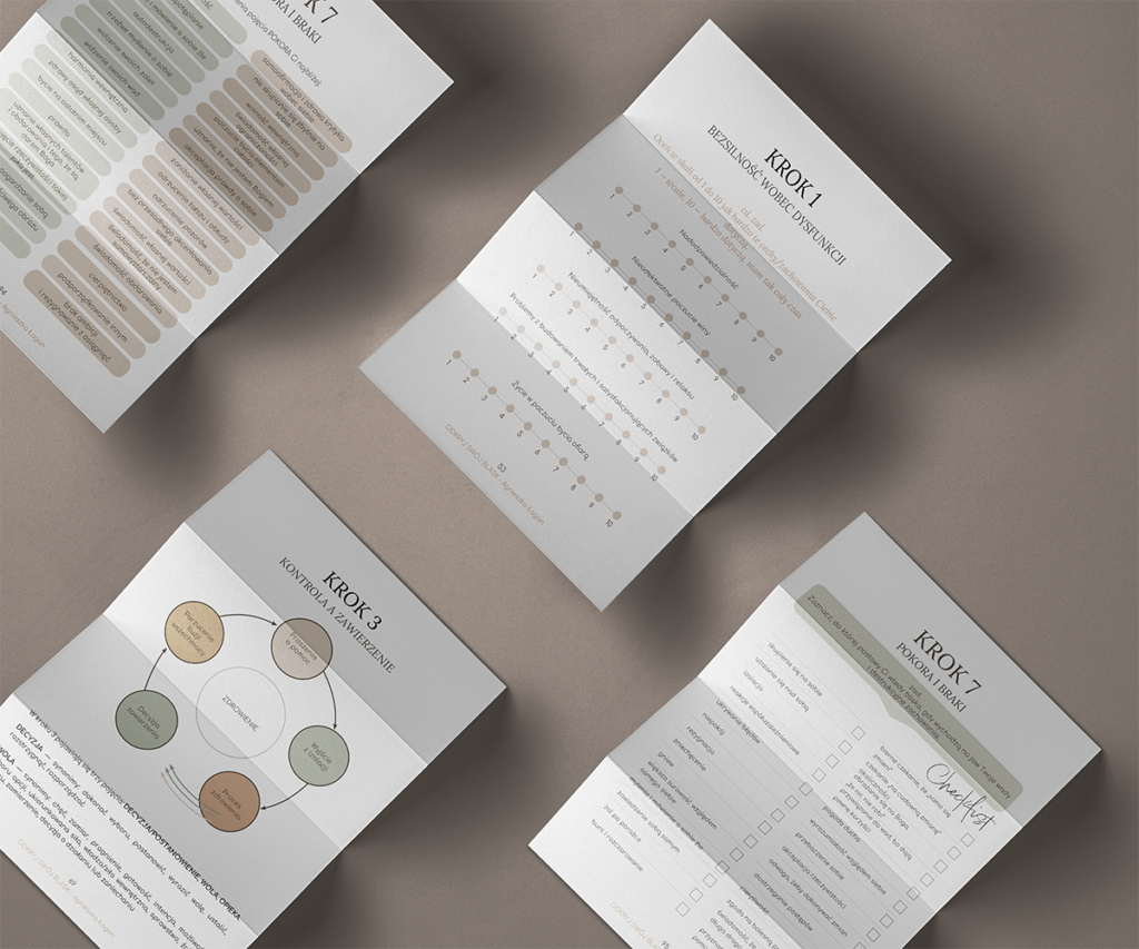 Karty pracy – zadają właściwe pytania. Pozwolą Ci głębiej pracować nad swoim wnętrzem. Ćwiczenia, zadania, plansze, check-listy pomogą Ci zrozumieć siebie i swoje zachowania. Podprowadzą do dobrych decyzji, wskażą kierunki Twojego rozwoju.